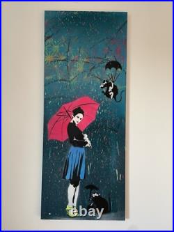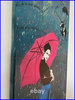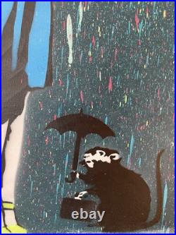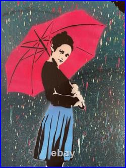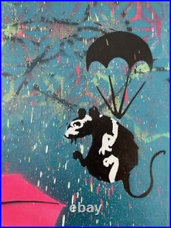 Hommage à Banksy par l’artiste 13.13 The Lover. Peinture originale de 2021, unique. Peinture aérosol et pochoir sur toile sur châssis. Signé main au dos. Illustration graffiti par technique mixte de 13.13 allias The Lover (1981) artiste allemand, surtout connu par son imagerie pop emblématique. Ses ouvres ont été présentées dans le monde entier et se retrouvent dans certains livres de street art. Il a organisé l’exposition WE ARE FRIENDS avec plusieurs artistes amis. Titre: Oh, hello there. Acheté directement à l’artiste.